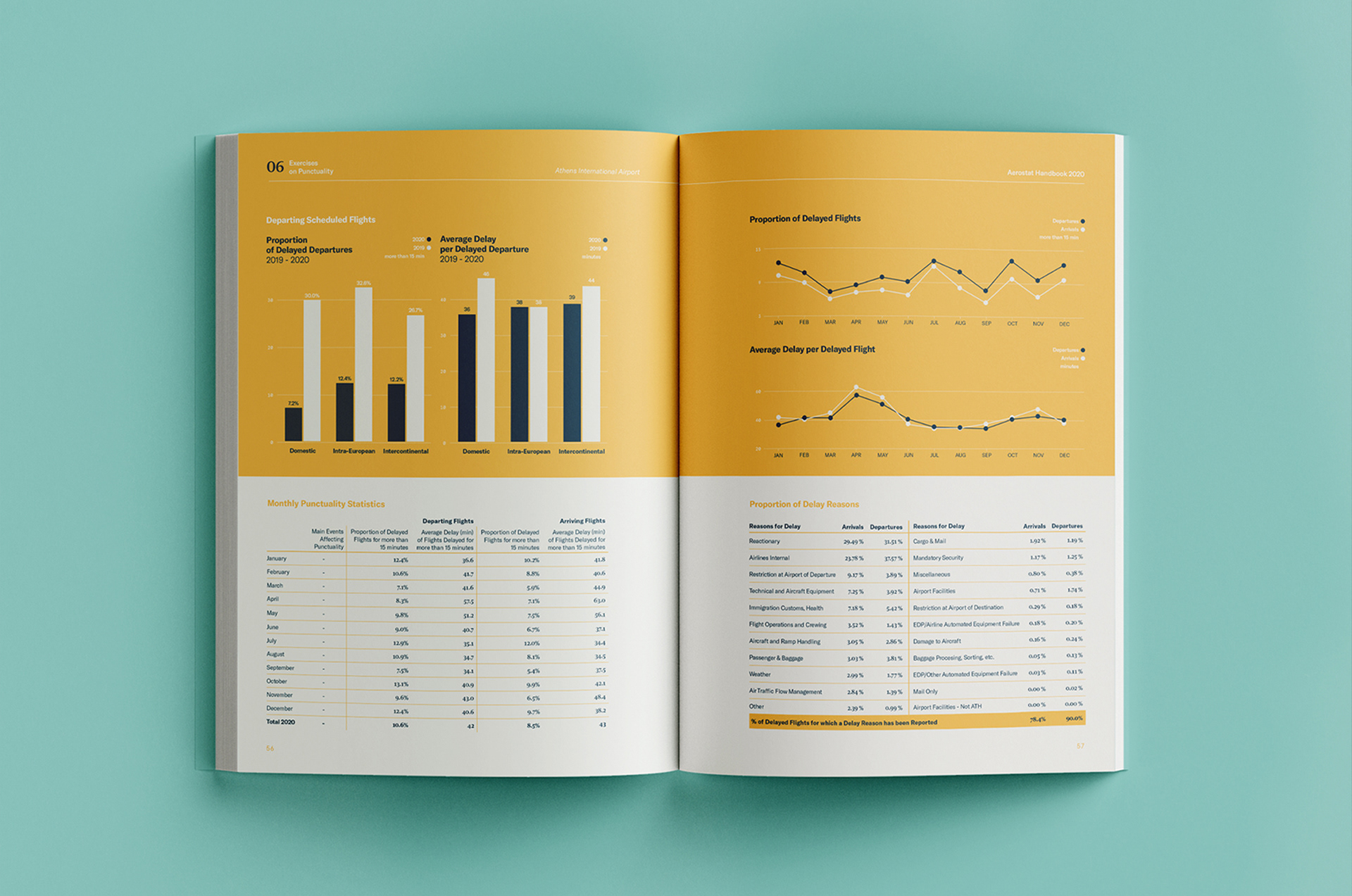 Corporate annual report design for Athens International Airport. The latest edition covers the financial year 2020 and was designed with the aim of allowing the facts to take center stage, while at the same time achieving a practical and attractive feel. This report includes all 2020 information regarding typical traffic segments, main operational processes, passengers’ profile, incoming and outgoing tourism traffic passing through the Airport and emerging market trends in Greece and worldwide.